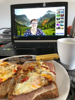 Voor de Corona Quarantaine nam ik mijn ontbijt ook al mee naar werk. Zo vroeg in de morgen heb ik nog geen trek en een beker yoghurt lepelt makkelijk weg achter je computer. Ik mis alleen de cappuccino van kantoor in de morgen. Ik nam er altijd eentje in de morgen, om wakker te worden. De rest van de dag drink ik meestal thee of ik vergeet te drinken als het druk is. Dat is hier thuis trouwens niet anders. Als ik eenmaal een beetje in mijn werk zit, dan kan ik alles om me heen vergeten, en dus ook mijn inwendige mens. Gelukkig doet Paul af en toe nog een beker thee in de aanbieding.